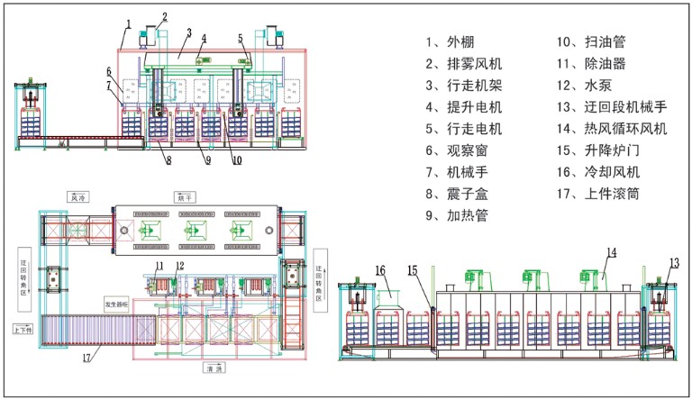 人工將工件首先放入小工件籃內(nèi),再將小工件籃放置于吊籃內(nèi),然后將吊籃放在上件處滾筒平臺上(自動定位)。整套設(shè)備由PLC可編程控制器控制,機械手自動將吊籃放入超聲波除油槽,清洗時間(節(jié)拍)根據(jù)工件的產(chǎn)量及工件的污染狀態(tài)可調(diào),到達設(shè)定時間后,機械手依次將吊籃放入下道清洗槽,直至將吊籃放入過渡區(qū)輸送鏈上:然后由迂回轉(zhuǎn)角機械手將吊籃放入烘干爐上件段輸送鏈上,經(jīng)烘干、風冷,然后再由迂回轉(zhuǎn)角機械手將吊籃放入清洗段上件輸送滾筒上(注:設(shè)備上、下件為同一工位)。
